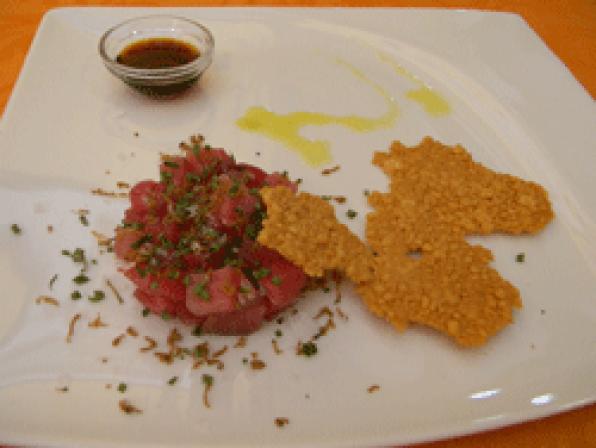 Cuiner: Carlos Martínez Cap de sala: Rafael Martínez Tipus de cuina: Casolana Capacitat: 35 persones Horari: De 13 a 15h. Descans setmanal: Dimecres Preu: 38 euros Adreça: Ermita de Santa Marina – Pratdip Entrant: Entrant degustatiu i copa de cava. Primer plat: Tàrtar de tonyina amb tòfona blanca de la Serra de Llaberia, vinagreta de balsàmic i teula de parmesà. Segon plat: Tonyina a la brasa amb olivada i tomàquet al forn. Postre: Pastís de fruits secs. Bodega: vi La Cuina d’en Carlos – D.O. Montsant Tàrtar de tonyina amb tòfona blanca de la Serra de Llaberia, vinagreta de balsàmic i teula de parmesà. Ingredients per a 4 persones - 500 gr, de llom de tonyina - 20 cl. de vinagre balsàmic - 2 filets d’anxoves amb salaó - 110 cl. d’oli d’oliva verge extra D.O. Siurana - suc de llimona - escates de sal - cebollí picat - tòfona blanca (serra de Llaberia) - 100 gr. de formatge parmesà - 20 gr. de farina - Paper pel forn RECEPTA Tallem la tonyina en daus de 1cm.x 1cm. En un bol preparem la vinagreta, emulsionant l’oli d’oliva, el vinagre balsàmic, les anxoves (nétes fent una pasta) i suc de llimona. A continuación, barrejarem els daus de la tonyina amb la vinagreta. Per fer la teula de formatge parmesà, el posarem a la picadora, el deixarem ben finet i el barrejarem amb la farina. En una safata pel forn, posem el paper pel forn i estenem el formatge. Ho fornejem a 180 ºC, uns 8 o 10 minuts. Después ho deixem refredar i el tallem, simulant triangles. Amb l’ajuda d’ un motlle rodó, posem els daus de tonyina amanits amb la vinagreta i al damunt làmines de tòfona blanca, ho salem amb la flor de sal, afegint-hi el cebollí picat. Emplatem la teula de parmesà i al damunt el tàrtar de tonyina.