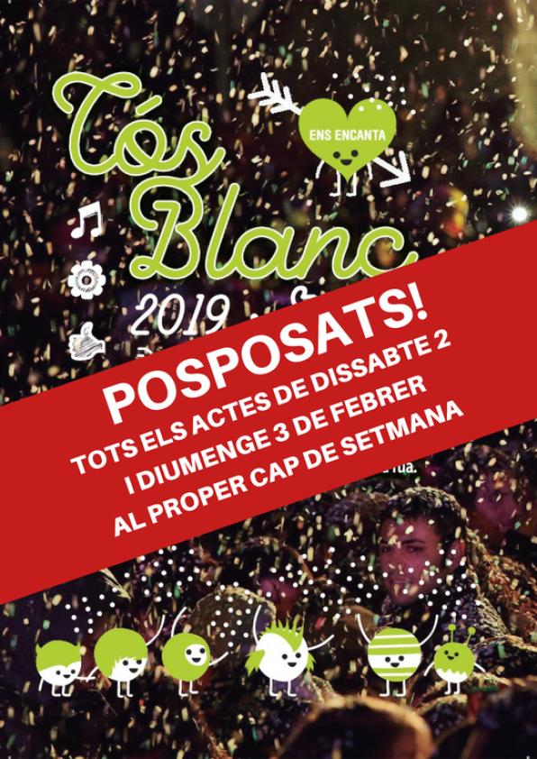 Les previsions climatològiques adverses per aquest cap de setmana (2 i 3 de febrer) han obligat a posposar tots els actes festius a la setmana que ve. Així ho ha decidit l'Ajuntament de Salou en una reunió després de conèixer els informes tècnics i de protecció civil, que desaconsellen l’organització de les activitats a l’aire lliure per les adverses condicions climatològiques que es preveuen; amb ràfegues de vents sostingudes que farien perillosa la celebració de la festa, i podrien posar en perill la integritat física de les persones. Així, s’ha acordat que la totalitat de les activitats que van des de dissabte 2 de febrer a les 6.30h amb la matinada jove amb xaranga i fins al darrer acte del ball de festa a l’envelat del diumenge a les 20.30h queden posposats una setmana. Tots els actes es traslladaran al dissabte 9 (dia del Cós Blanc) i el diumenge 10, mantenint les mateixes hores, emplaçaments i recorreguts.