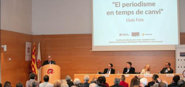Salou. Costa Daurada. 20 abril 2018. Repsol i la Universitat Rovira i Virgili s'han felicitat per la longevitat de la seva vincle de col·laboració al voltant de la Càtedra Internacional URV / Repsol d'Excel·lència en Comunicació, que compleix una dècada. La companyia aportarà 100.000 euros en els pròxims tres anys perquè aquesta activitat docent segueixi desenvolupant activitats d'investigació i divulgació científica d'alt nivell en l'entorn de la comunicació. D'aquesta manera, la firma pretén reforçar la competitivitat de l'entorn industrial de Tarragona, on s'ubica. La doble celebració: el desè aniversari de la iniciativa i el compromís de renovació han tingut al periodista Lluís Foix seu mestre de cerimònia. Foix ha pronunciat la conferència "El periodisme en temps de canvi" durant l'acte commemoratiu que ha tingut com a escenari el Paranimf de la URV.