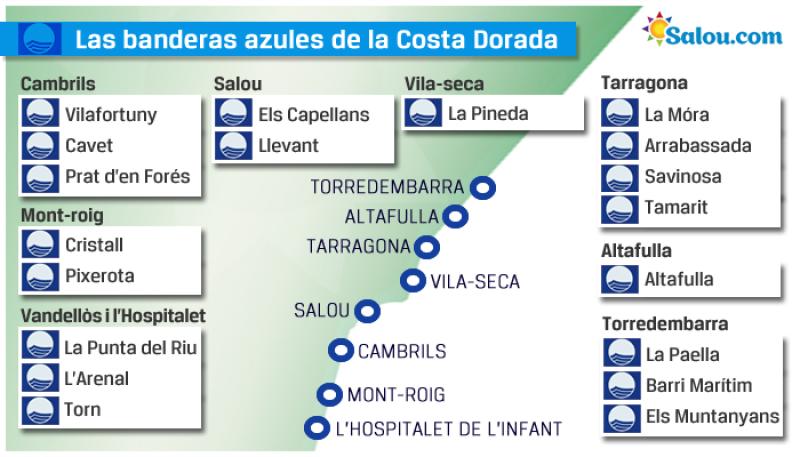 Salou. Costa Daurada. Les platges de la Costa Daurada tornen a destacar entre les platges de tot el país; platges que han aconseguit per a aquest estiu fins a 19 banderes blaves, entre els municipis de L'Hospitalet de l'Infant i Vandellós, Cambrils, Mont-roig, Vila-seca, Altafulla, Torredembarra, Tarragona i Salou. La bandera blava és una distinció que atorga l'Associació d'Educació Ambiental i del Consumidor (ADEAC). A Salou, les platges de Capellans i Llevant revaliden un any més les banderes blaves en reconeixement per la seva qualitat ambiental. També ha obtingut bandera blava el Port Esportiu de Salou. Les platges han superat els exàmens realitzats per aquests organismes en base a quatre criteris: qualitat de les aigües de bany, informació i educació ambiental, gestió ambiental i seguretat, serveis i instal•lacions. Aquest guardó s’atorga cada any, des de 1987, i es dona a aquelles platges que superen els exàmens de condicions higièniques, de seguretat, d’accés lliure, sostenibilitat, de compliment legislatiu, l’atenció a persones amb discapacitat i la oferta complementària i educativa, entre altres. La Bandera blava també premia la participació en iniciatives ambientals voluntàries de les autoritats municipals, la població local i visitant i els agents del sector del turisme. Enguany, a la Costa Daurada, un total de 37 platges i 8 Ports Esportius comptaran amb la Bandera Blava. Totes les platges amb bandera blava de la Costa Daurada i les Terres de l'Ebre