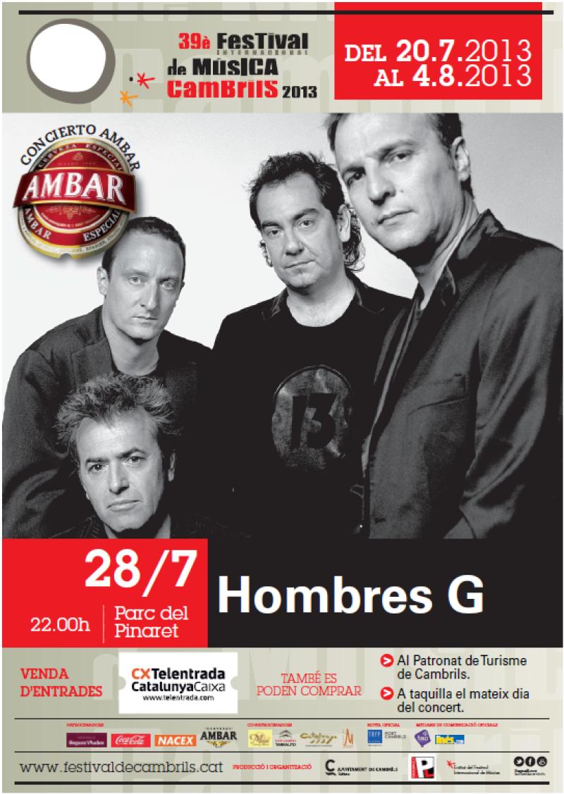 The International Music Festival of 2013 Cambrils offers on the eighth day of the Festival concert a rock band from Madrid, Hombres G. See the poster of the concert.