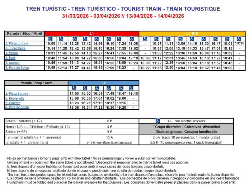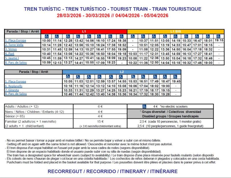 Schedules:The Salou tourist train changes its schedules depending on the time of year. The detailed table of the schedules can be consulted in the attached image, as well as a map of the route.