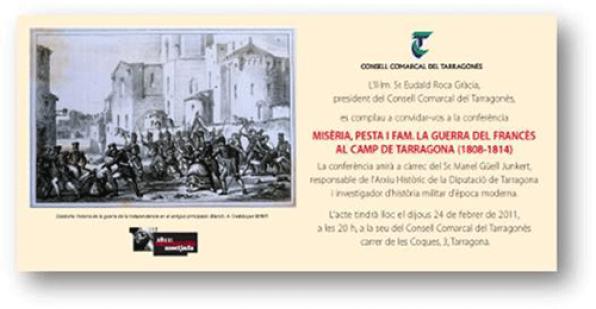 MISERIA, PESTE Y HAMBRE. LA GUERRA DEL FRANCÉS AL CAMP DE TARRAGONA (1808-1814) Jueves 24 de febrero, a las 8 de la tarde Conferència a cargo de Manel Güell. Dentro de los actos conmemorativos del Bicentenario del asedio de Tarragona en la Guerra del Francés, el Consejo Comarcal del Tarragonès ha programado para el Jueves 24 de febrero, a las 8 de la tarde, la conferencia Miseria, peste y hambre. La guerra del Francés en el Camp de Tarragona (1808-1814), a cargo de Manel Güell. En la época moderna la dinámica de una guerra, además contar con la muerte de militares y de civiles inocentes, y la destrucción de inmuebles y cosechas, solía conllevar también epidemias contagiosas, miseria y hambre. Este contexto de crisis generalizada se traducía en un periodo de clara involución demográfica, perfectamente constatable en cifras a través de la documentación de la época. Han perdurado muchos de los testimonios escritos sobre la guerra del Francés (1808-1814). La tragedia se extendió por todo el país, y Tarragona y su comarca no fueron una excepción, por el contrario, el caso de la zona tarraconense es uno de los más duros. Manel Güell es licenciado en Geografía e Historia por la Universidad Rovira i Virgili de Tarragona y post grado en archivística, es el encargado del Archivo Histórico de la Diputación de Tarragona. Investigador de historia militar de época moderna, ha publicado numerosos artículos en revistas del sector y presentado comunicaciones en congresos. En 2008 ganó una beca del Institut Ramon Muntaner para investigar el aspecto demográfico de la guerra del Francés en el Camp de Tarragona, y entre 2009-2010 ha dado varias conferencias sobre el tema.