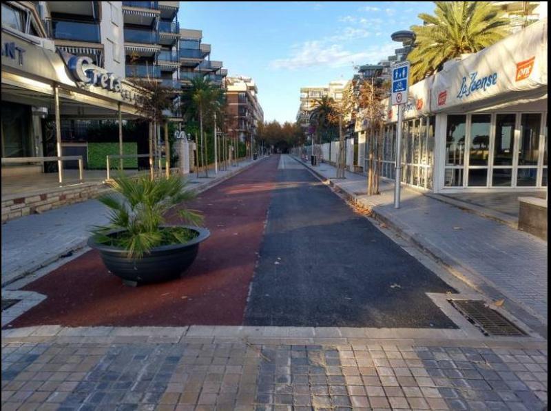 Salou. Costa Dorada. 15 noviembre 2018. El tram del carrer Josep Carner comprés entre el carrer Major i el passeig Jaume I presenta aquests dies un nou aspecte, ja que l'Ajuntament ha decidit actuar sobre el paviment asfàltic vermell que indica el carril bici. Les obres afecten una superfície de 373,75 metres quadrats, on s’ha procedit a l’adequació del paviment asfàltic renovant, principalment la capa de rodament en color vermell i la modificació de la senyalització horitzontal existent. El dijous i divendres van dur-se a terme els treballs d’asfaltat i ara resta pendent la finalització dels treballs amb el pintat del nou pas de vianants, i el pintat dels símbols i línies corresponents. Les obres de manteniment de la ciutat s’han adjudicat per un import de 22.560,65€. Es tracta d’unes obres que pretenen millorar l’accessibilitat de les bicicletes creant carrils de circulació exclusius.
