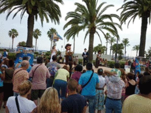 Cambrils. Costa Dorada. 5 de julio de 2012. El Patronato de Turismo de Cambrils ha programado un conjunto de actividades dirigidas a los más pequeños durante los meses de julio y agosto. Se trata de un programa específicamente pensado para familias con niños que este año se ha incrementado tanto en el número como en diversidad incluyendo payasos, talleres de circo, música, juegos gigantes y títeres, entre otras actividades. El programa de actividades infantiles presenta el espectáculo musical "Canta con Woody" realizado por PortAventura. Este espectáculo musical dirigido a todos los públicos, se repetirá cada jueves a las 20hs durante los meses de Julio y agosto en el Parque de los Pescadores.